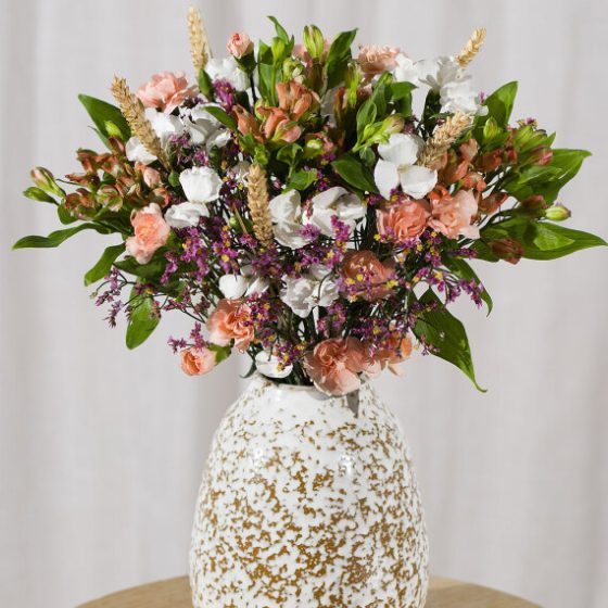 An enchanting mix of warm amber blooms, featuring clusters of delicate Florinca Alstroemeria, Carnations and festive foliage. This charming letterbox bouquet showcases the beautiful colours of the season with its sophisticated blend of copper tones. Our letterbox flower gifts are delivered in specially designed letterbox friendly packaging and protected by fully compostable brown paper wrap, ensuring a wonderful and creative gift for the recipient.