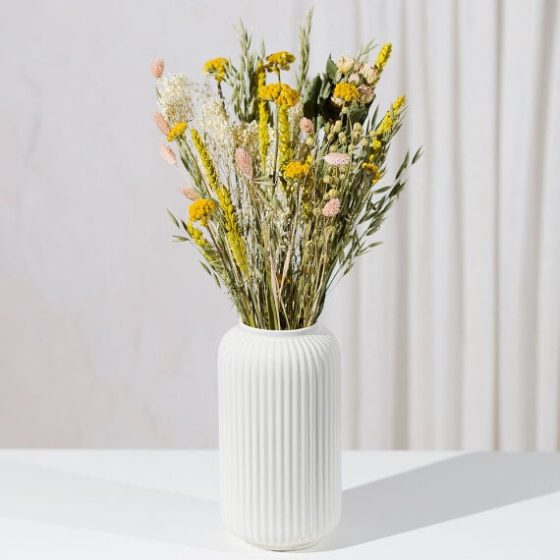 A delightful burst of sunshine captured in a dried flower bouquet, featuring a charming blend of cheerful yellow blooms paired with soft pink florals. Perfect for adding a lasting touch of colour to any space, these naturally preserved flowers require no water and will maintain their beauty for months. Delivered in letterbox-friendly packaging.